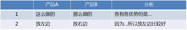 - 取长补短:选取竞品可借鉴的地方,对本品做出改进
