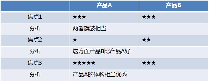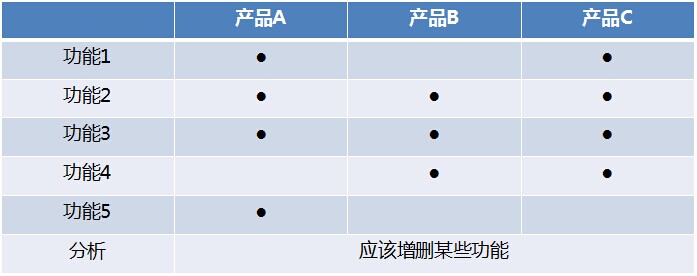 主要是针对功能点的比较——有或没有。判断出,和竞争对手相比,我们有哪些弱点或优势,并随之进行调整。
