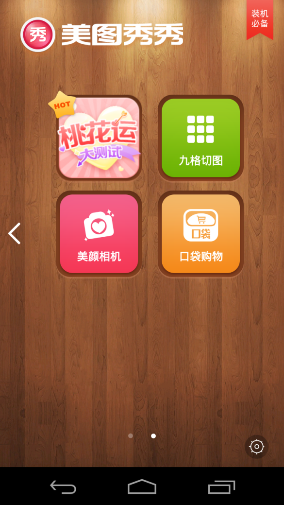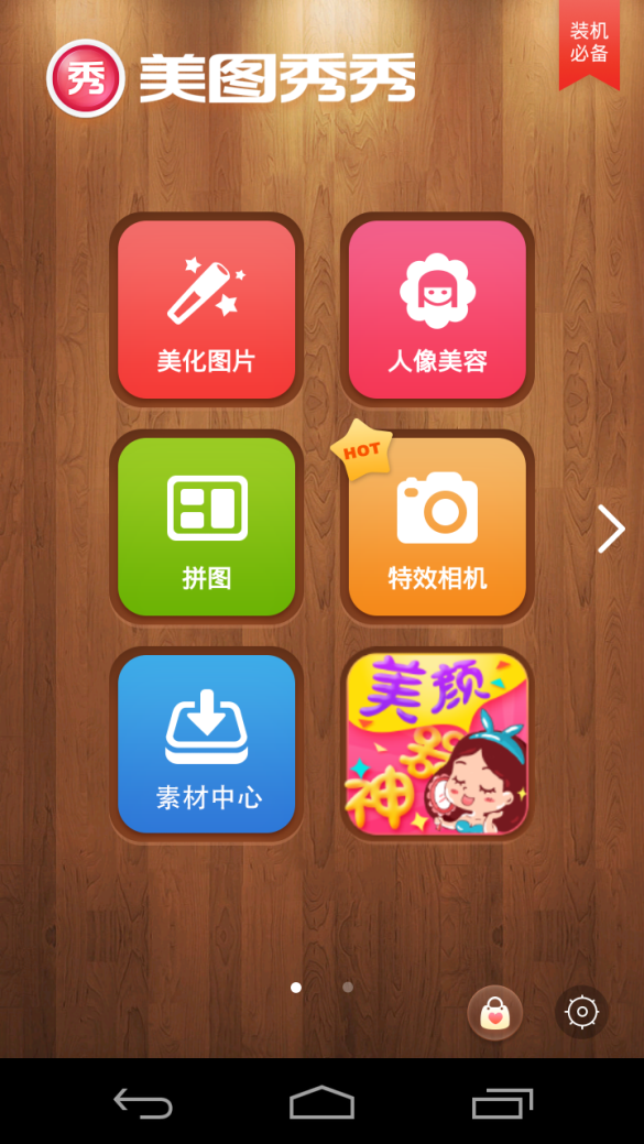 右下的功能模块变为动态的推广信息,和最右下角设置按钮旁边也多了一个带动画按钮,从用户的角度看,干扰了用户使用。但细想一下美图秀秀的主用户群是女孩子,那这些推广的内容就有必要了,爱美的妹子都会去点一下,看一下,从而提高用户的粘度。