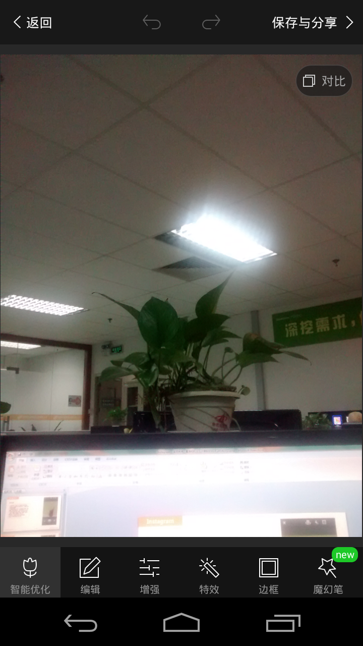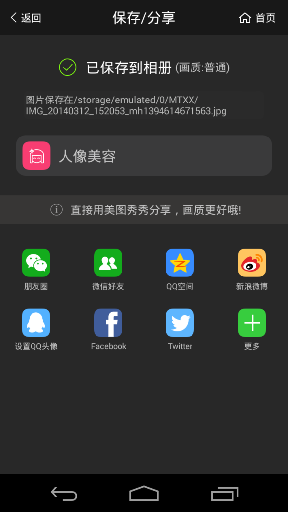 保存后,可分享到各种社交应用,操作简便。对于保存后的照片,在美图秀秀应用内是找不到,没有提供我美化过的照片浏览功能。需要退出应用到系统相册去找。在应用内找不到用户自己的美化作品,对于用户来说会有点失落感。