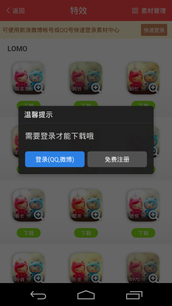 在素材中心下载各种素材体验不错,登录操作也简单。登录后在主页上没有任何登录信息展示,如头像或ID。