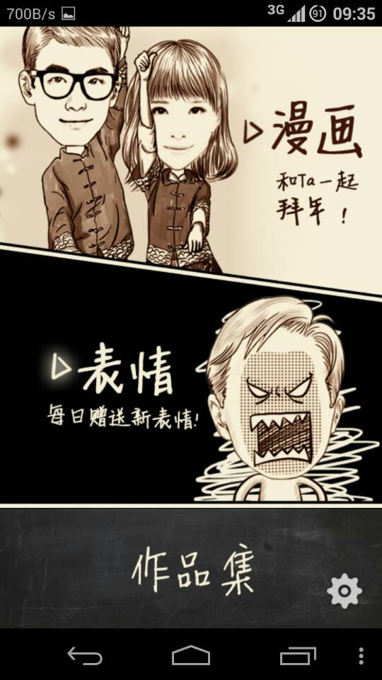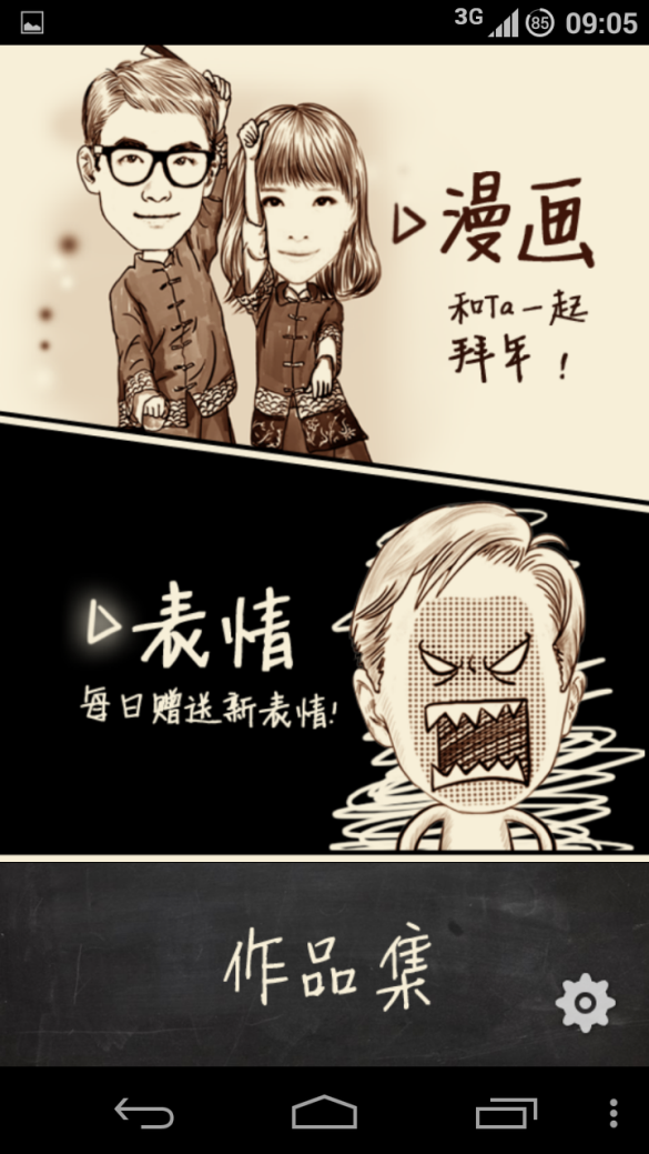 迈出一步尝试,点击了‘漫画’,后才真正知道原来是可以点的。这里体验一般,用户需要去发现,而不是通过界面UI向用户传达信息。魔漫相机也做了一个补救方法,触摸‘漫画’时上面整一大块都会放大,这可以让用户知道,这里整块都是可以点的,下次使用可以尝试。信息架构有点不合理,设置按钮叠在作品集上。