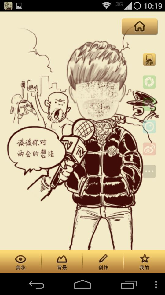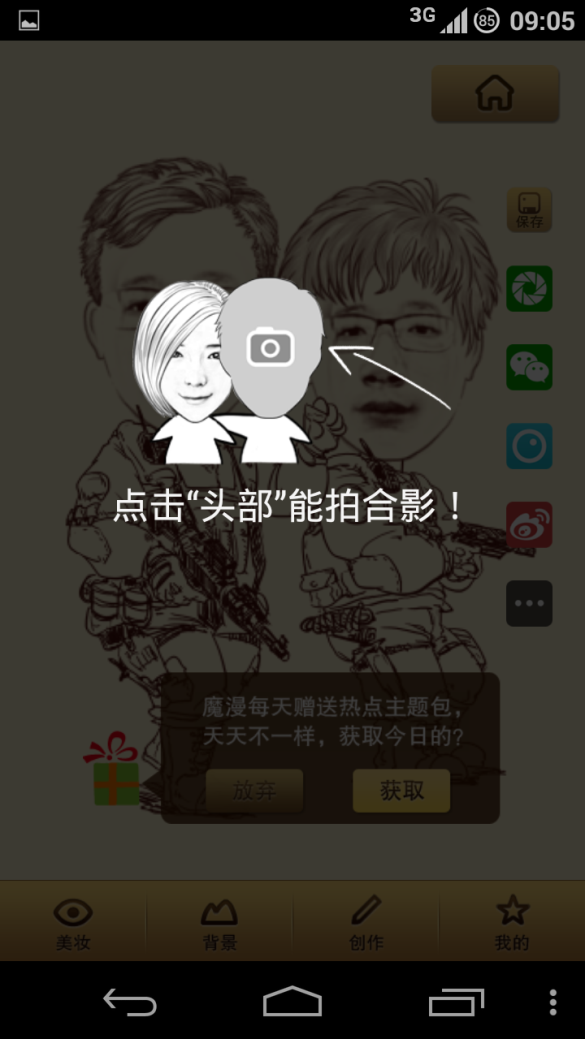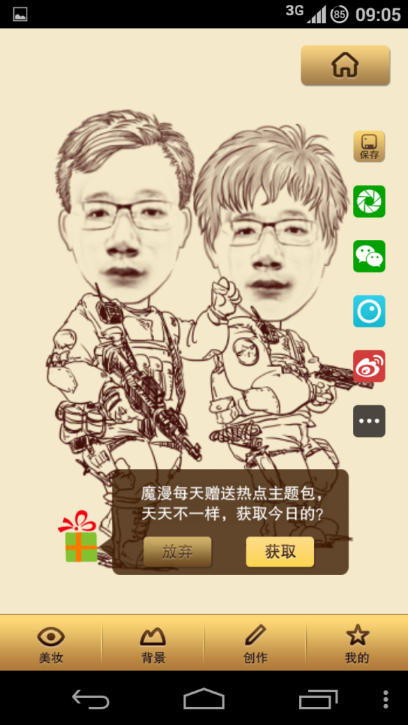 获取了今天的主题包后,漫画图会马上换成刚获取的主题,替换前可使用咨询的交互方式,这样会更加友好。主题包内是有多张漫画效果的,但我在屏幕上尝试使劲地上下左右滑动,没有任何反应。也找不到如何把这个漫画图换成其他的,体验糟糕。但它还是有一点好的设计就是右边那列分享按钮会变成半透明,降低对用户干扰,又能产品需要。