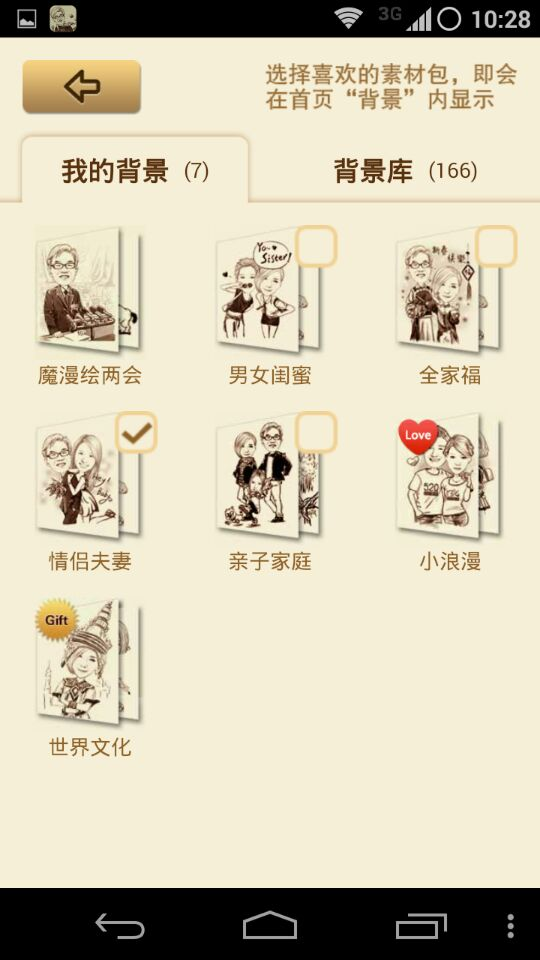 进入到‘我的’,实则是素材库。右上提示选中的素材包会在首页‘背景’显示。‘两会’主题是默认必选,不能取消
