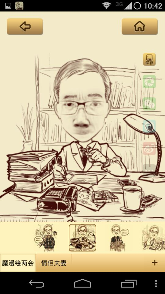 上面吐槽的换漫画效果图,原来在这里,需要点击‘背景’后才显示切换选项。信息架构和交互设计的不恰当,导致了前面像我这种笨用户的糟糕体验。选好后,你会发现保存按钮被设计得很细,一个常用的按钮被设计成这样,是一个低级错误的交互设计。(苹果规范建议:44px,符合人类手指大小)