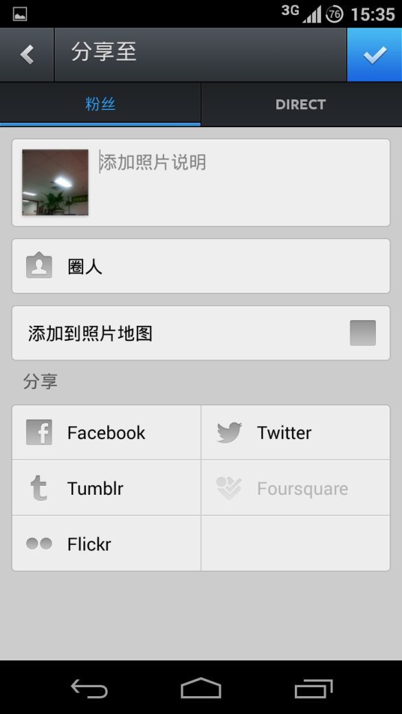分享照片最后一步,操作使用方便快捷,不填写任何内容也可以点击右上的‘完成’按钮